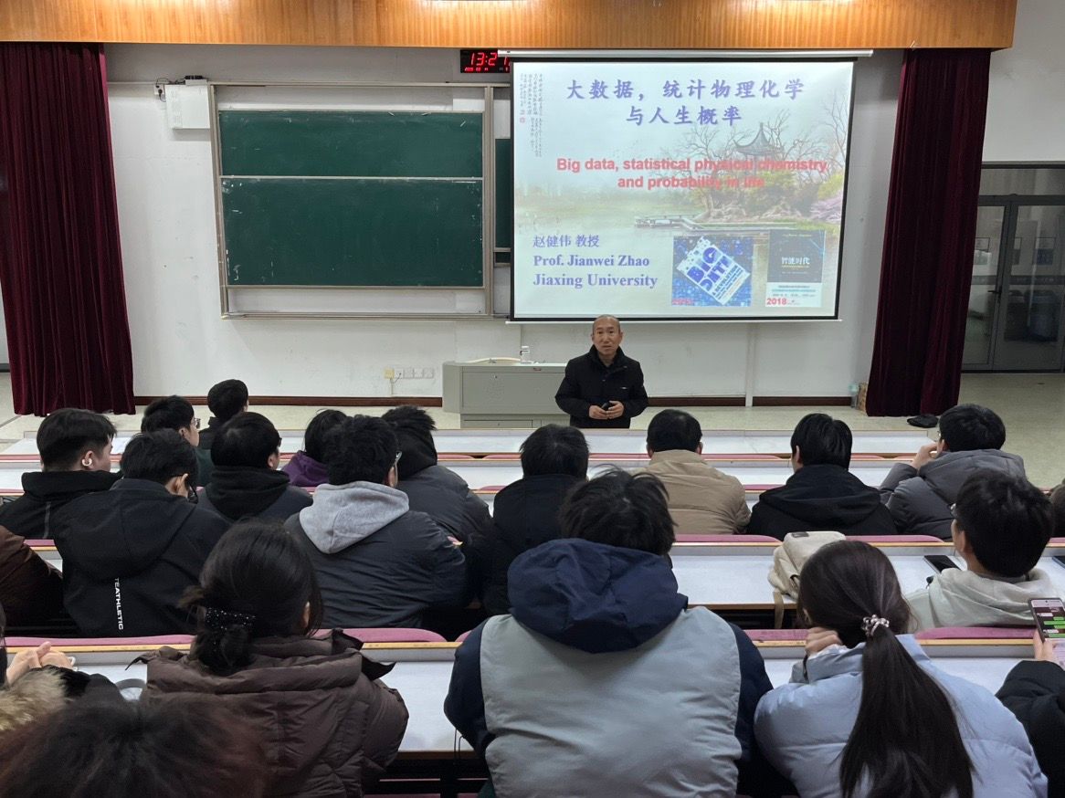 3月14日下午,太阳成集团tyc9728在博闻楼报告厅举办材子讲堂第二期。本次讲座由太阳成集团“南湖学者特聘教授”“尖峰团队”学术带头人赵健伟教授主讲,主题为“大数据、统计物理化学和人生概率”,2024级全体研究生参加。