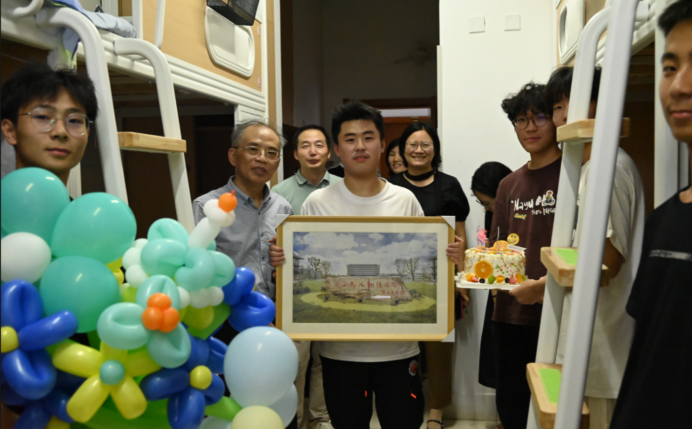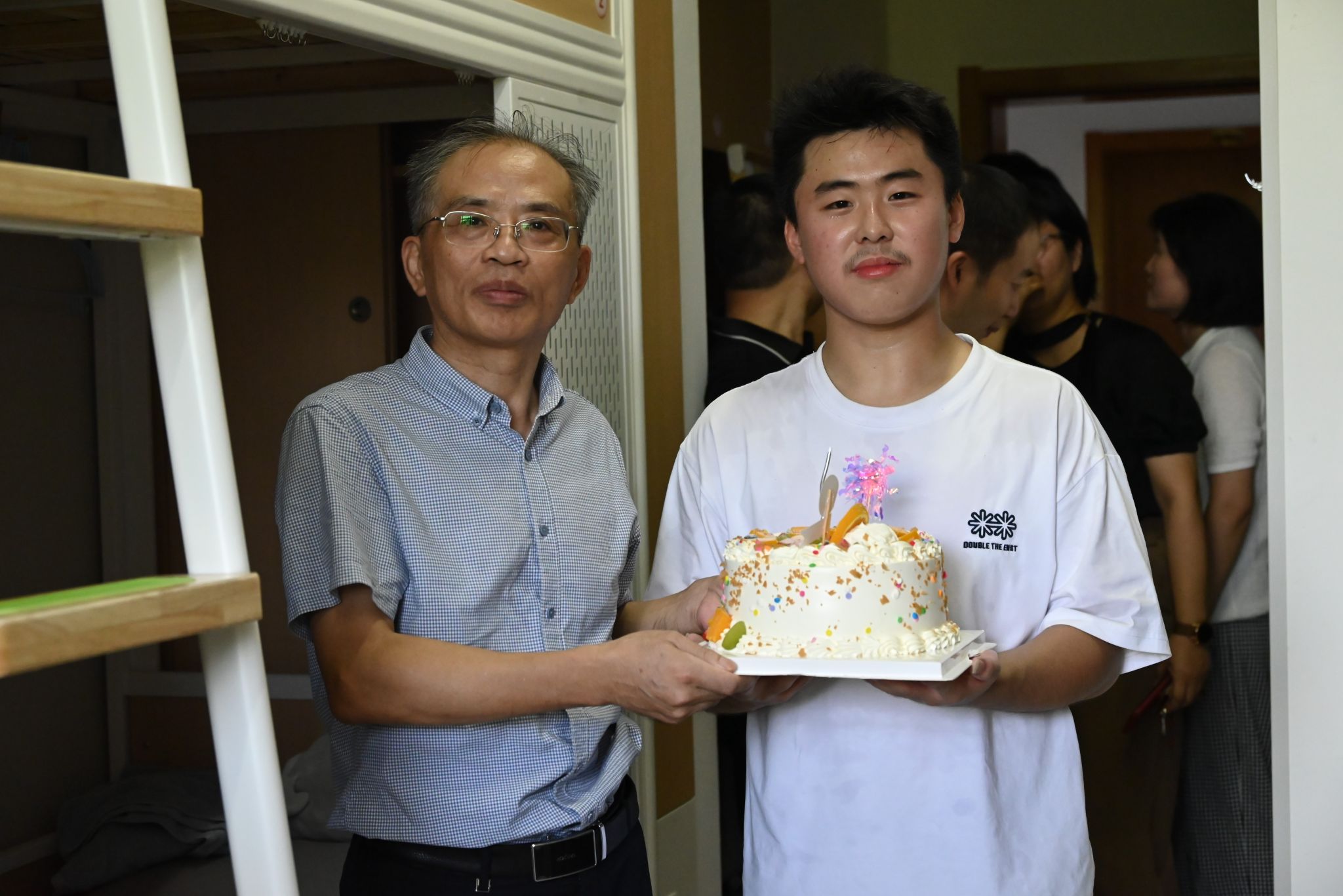 走访当天,恰逢一名2024级新生的18岁生日,学院特意准备了生日惊喜,用满满的仪式感为新生开启大学生活的序幕。钱书记为“小寿星”送上独特的生日礼物——一幅印有“方正为人 勤慎治学”嘉大校训的织物作品,递上生日蛋糕,给予了暖心祝福。小寿星从最初的惊讶到惊喜再到感动,他说:“领导老师们在报到当天很忙碌,但还是特地给我准备了这些礼物,我非常感谢,这让我更加坚定了在嘉大逐梦的信心,未来将勇于探索、不懈追求,努力在专业领域绽放光彩。”