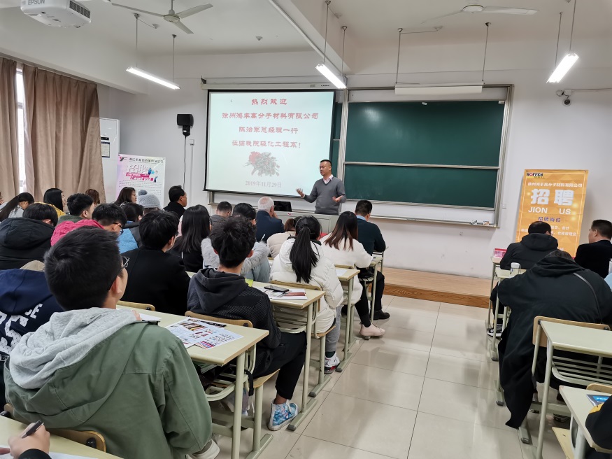 受院长委托,罗建勋代表学院及轻化工程系对客人们莅临我院表示热烈欢迎,感谢鸿丰公司对我院轻化工程专业教育事业的支持,同时,简要介绍了近年来轻化工程专业在专业建设、人才培养、教学科研及实验室建设等方面的发展情况。陈治军总经理和王新才总经理就行业的情况、人才的需求和成长给师生们做了分享。陈治军总经理和罗建勋主任分别代表鸿丰公司、轻化工程系签约“鸿丰皮革工匠奖学金”。随后,李林高工给师生了做了题为“励志皮革行业,成就无悔青春”的报告。在活动中,分别聘任陈治军总经理、李林高工为我院轻化工程系创新创业导师和校外兼职教师。另外,客人们还参观了轻化工程实验室。 最后,两家公司进行了招聘宣讲和面试。