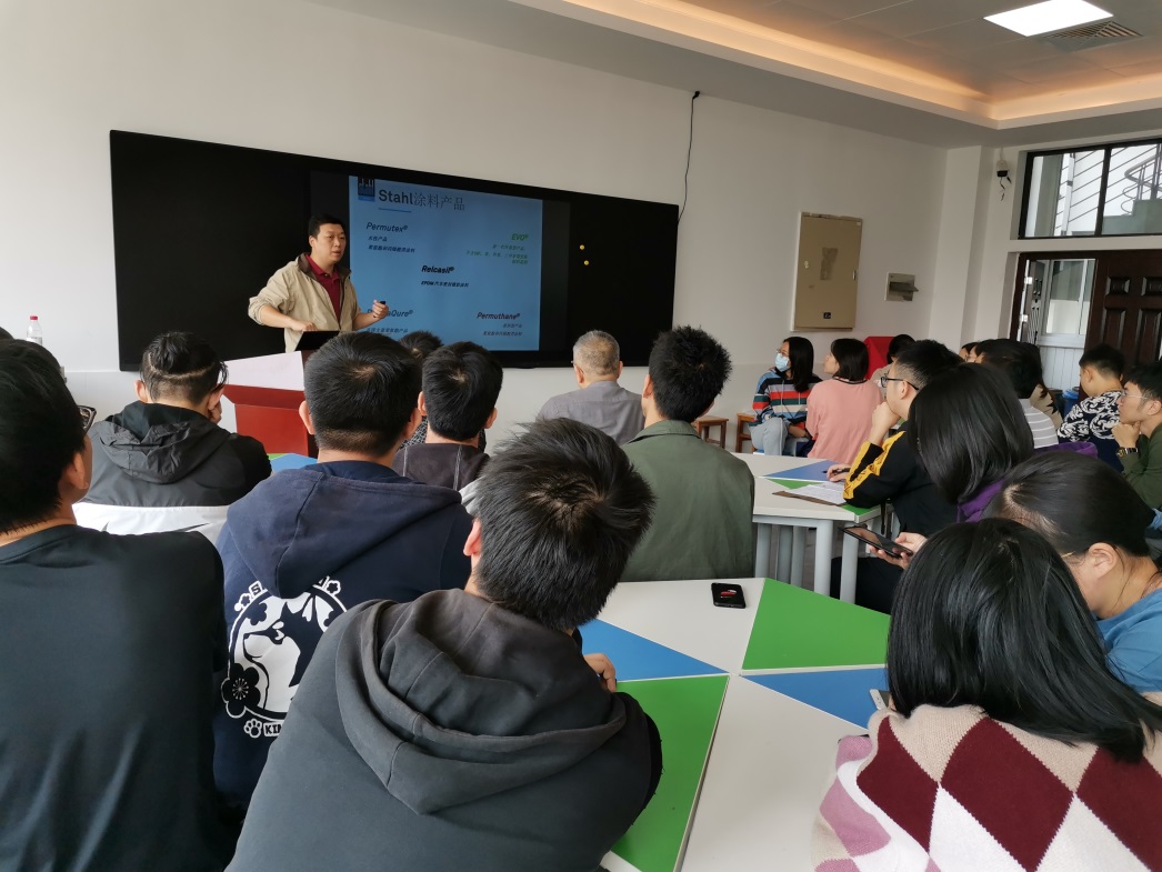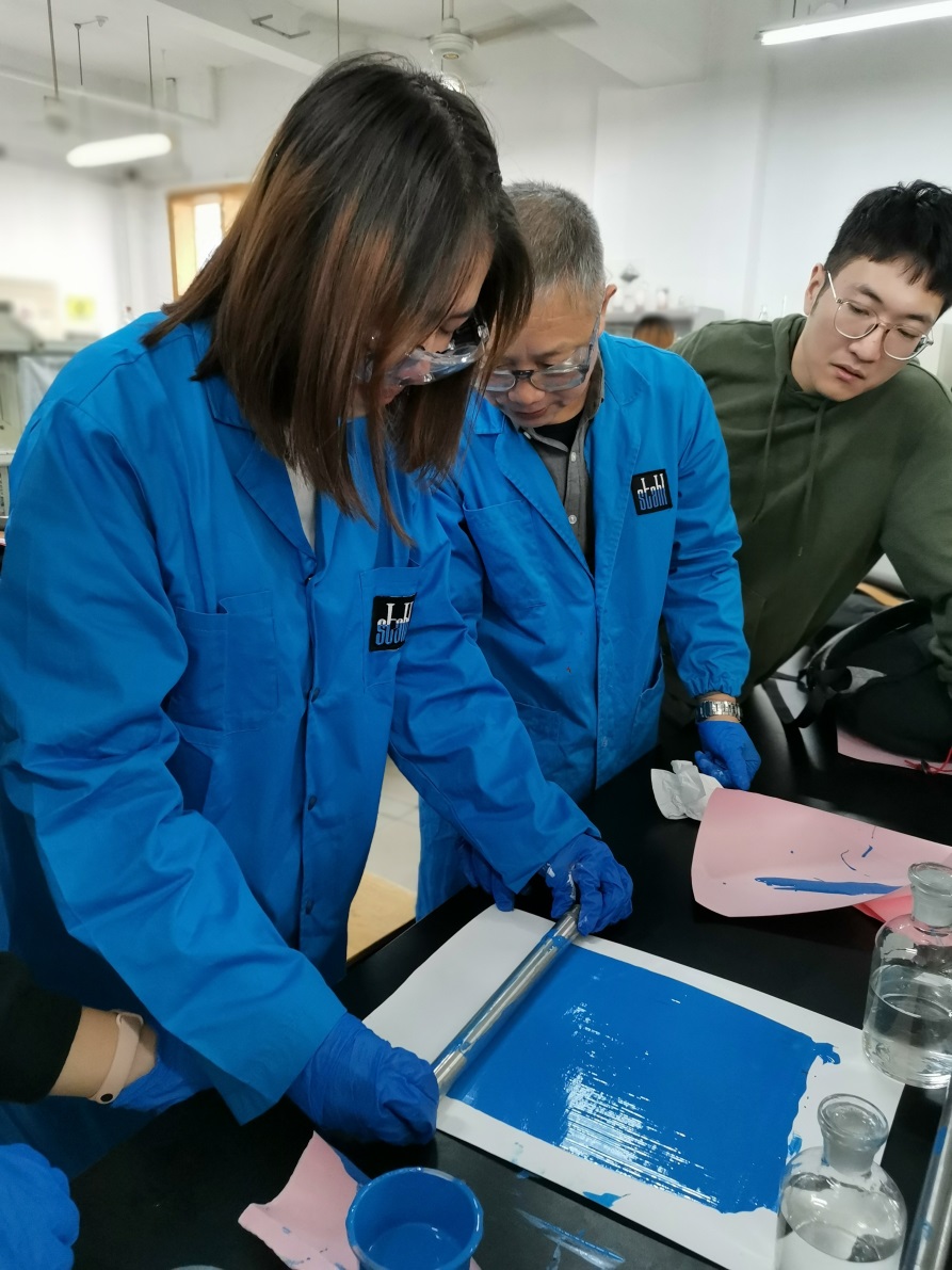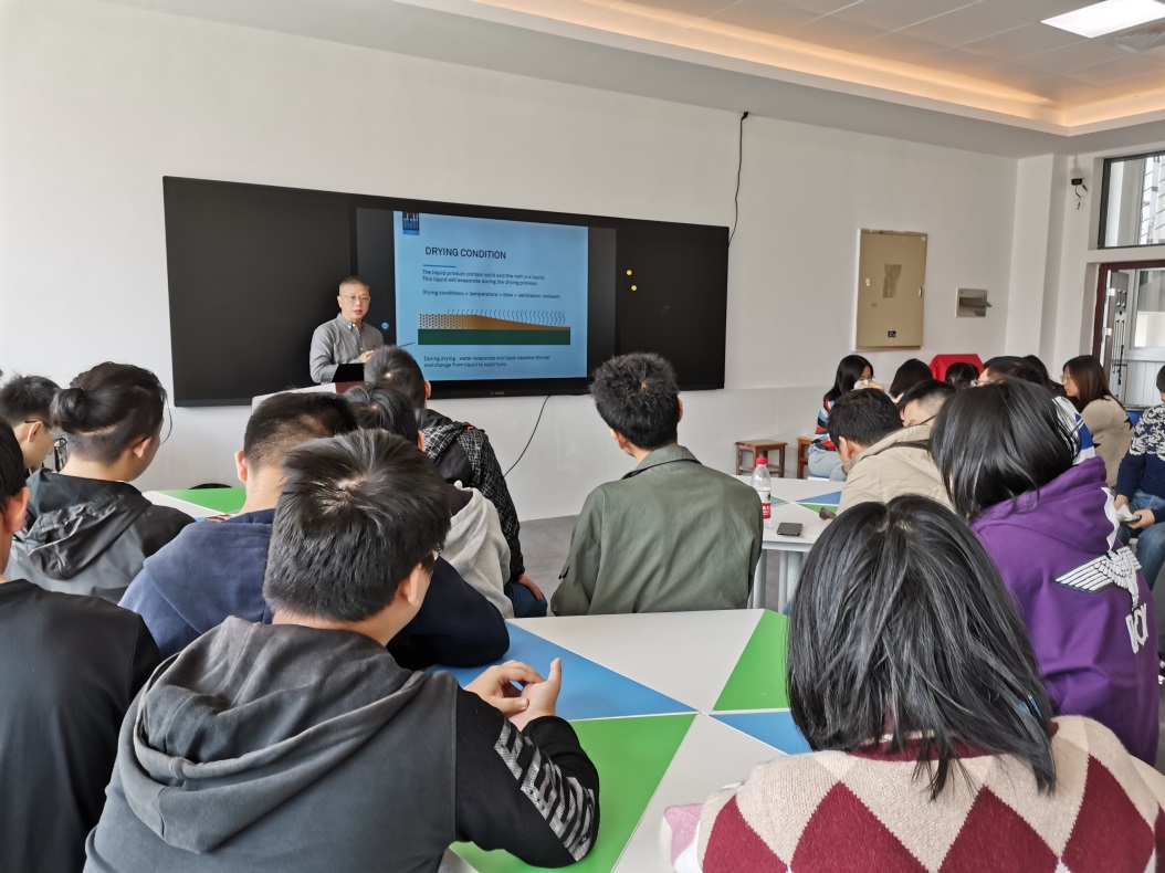 首先,郭祥经理做了“Performance coating高性能涂料”的报告,简单介绍了公司合成革部门的基本情况、高性能&环保型涂料及其在合成革上的应用。随后,夏敏经理做了“TRANSFER COATING”的主题报告,就合成革的工艺技术给师生们进行了讲解,同时与师生进行了互动交流。在报告后,夏经理、郭经理指导学生们合成革的干法和表面处理等实验。我院易洪雷院长亲切会见了两位嘉宾并就进一步的合作进行了洽谈。