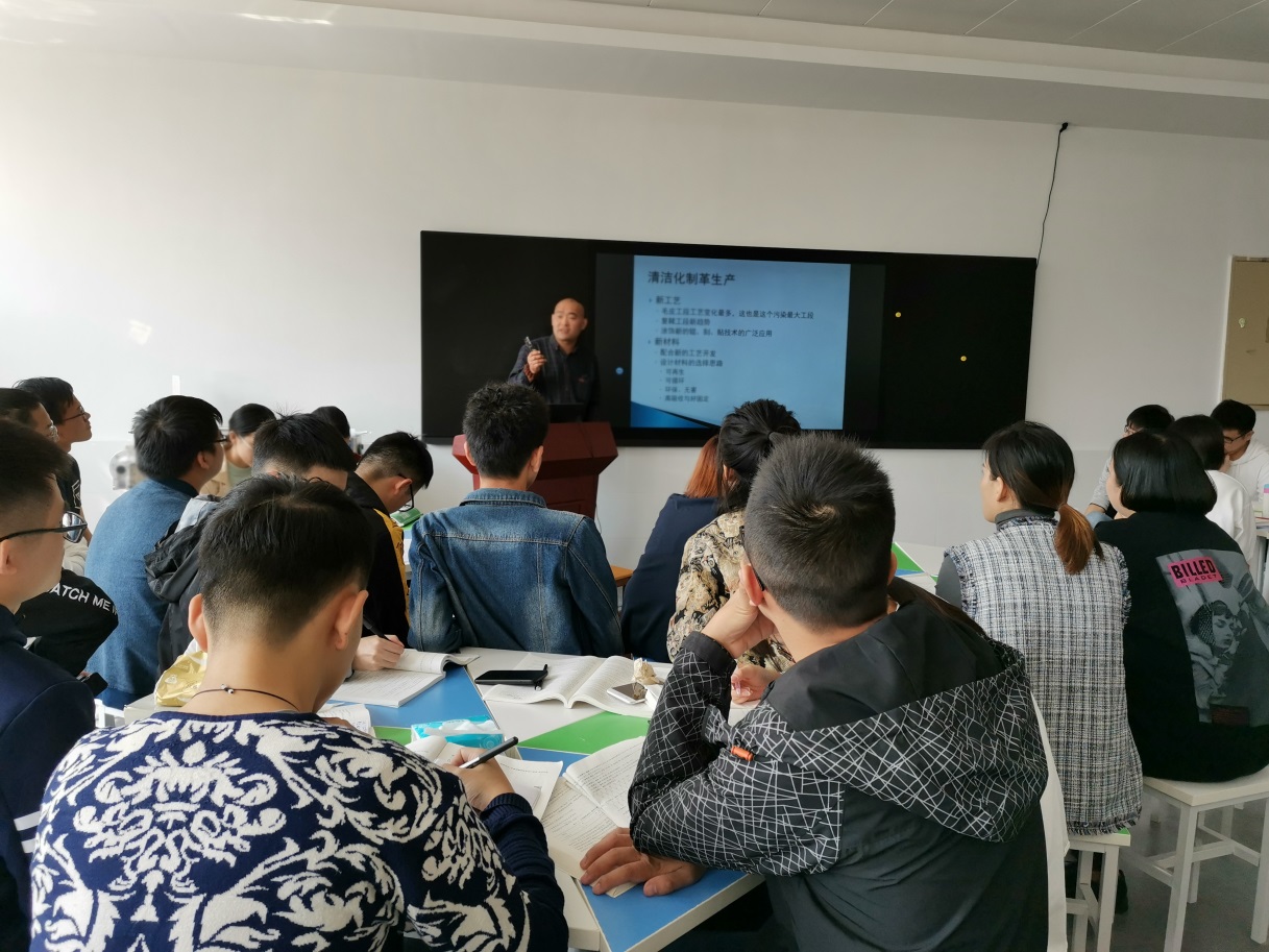 首先,周秀总经理做了“皮革人生大舞台”的报告,简单介绍了公司的基本情况、发展历程和公司对员工的要求,热忱欢迎毕业生到公司实习和工作。随后,王付军工程师做了“皮革生产新趋势—清洁化制革生产”的主题报告,就当前国家环保及市场对产品的要求进行了讲解,对皮革生产过程中的各工序进行了剖析并详细讲解了其设计和成功实施的清洁化铬鞣技术。最后,与师生进行了互动交流。该报告对毕业班学生受益匪浅。