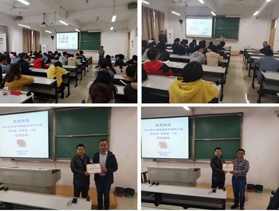 2018年11月13日,四川亭江新材料股份有限公司总经理任世军、技术研发部经理李靖博士、人力资源部胡经理一行来我校轻化工程专业招聘及交流。首先罗建勋主任代表轻化工程专业向任世军总经理、李靖博士颁发校外兼职教师聘书;随后,李靖博士为轻化工程专业全体师生做了主题为“无铬鞣研究最新进展——从研发到应用”的精彩报告,报告内容反映了数年来公司在新型无铬鞣剂研发方面的巨大投入及研发人员的辛勤付出;胡经理围绕公司的发展历程、薪资福利及人才培养需求等方面进行了细致讲解,会后及时了解了学生对工作的期望,并对轻化工程专业的部分学生进行了面试。