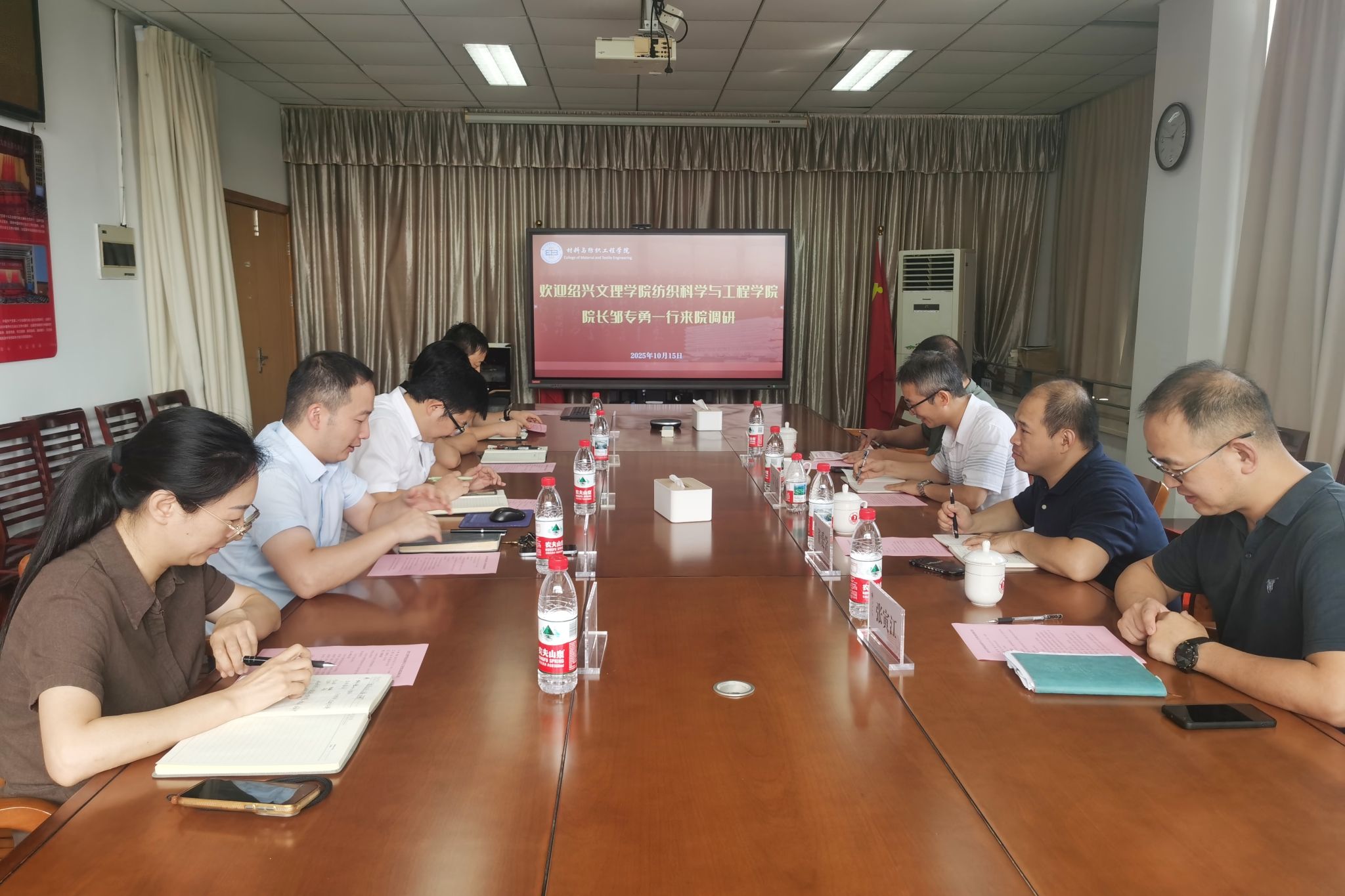 10月15日下午,绍兴文理学院纺织科学与工程学院院长邹专勇带队来院调研交流。学院党政班子成员出席会议。