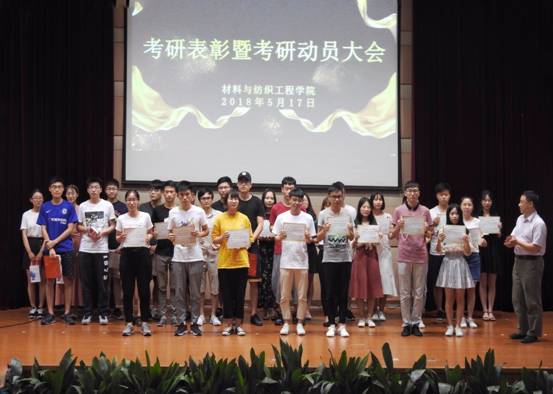 5月17日下午3:30,太阳成集团tyc9728在梁林TCL报告厅召开了2018年考研表彰暨动员大会,材纺学院院长易洪雷、院党委书记陈立力、院党委副书记黄芳芳、副院长李海东、纺织系主任曹建达、高材系主任代正伟、轻化系主任罗建勋、非织造专业负责人钱程、学工办老师以及考研学生等400余人参加了会议,会议由学工办主任李寒星主持。