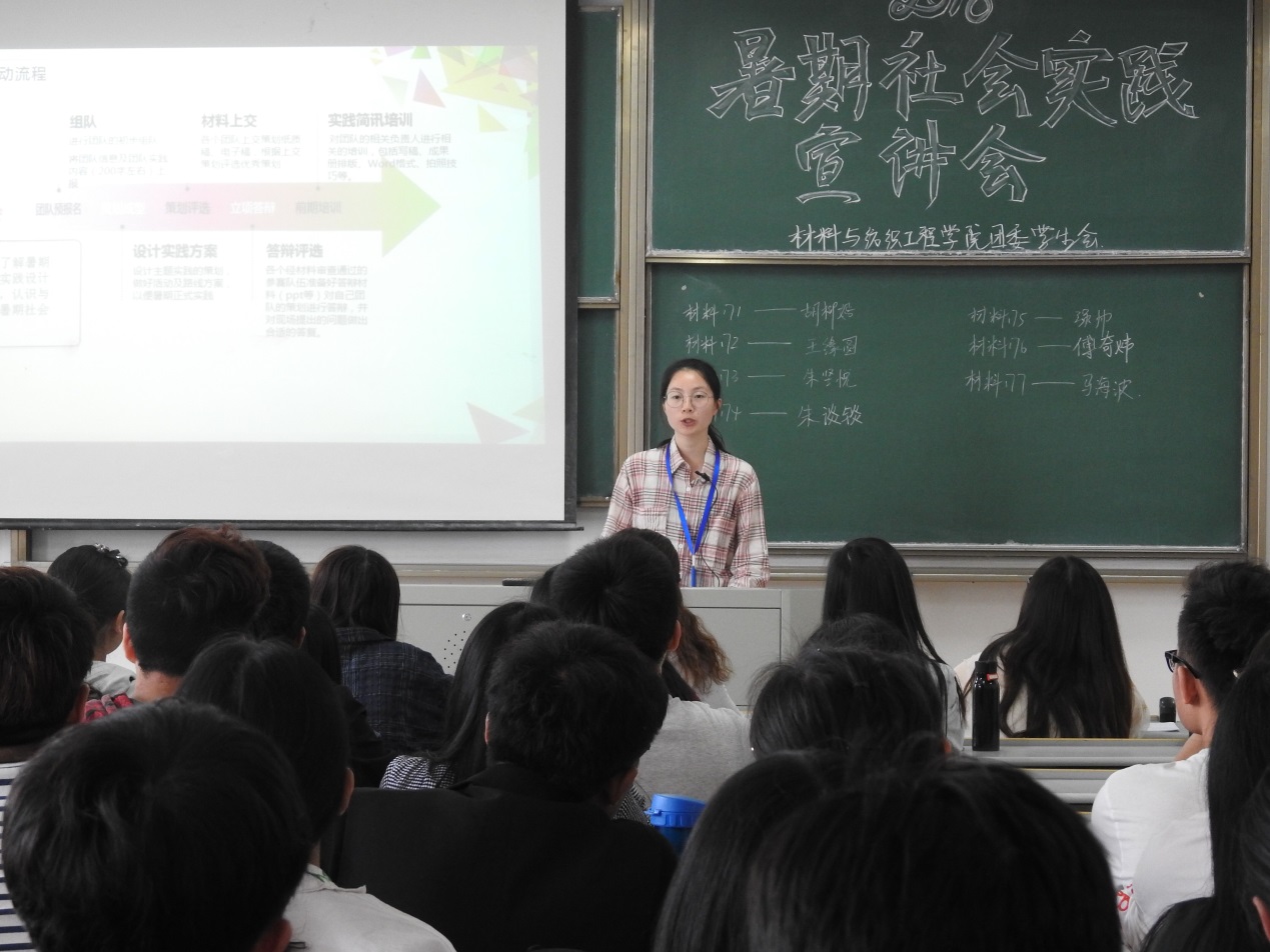 4月27日中午12:20,太阳成集团tyc9728团委召集材料类17级各班班委在十号楼402教室举行了“以实践之名 伴‘材’子之行”为主题的2018年暑期社会实践策划设计大赛宣讲会。学院团委副书记刘洋老师、2017年暑期社会实践校级“十佳团队”代表刘娜同学及“优秀团队”代表桑婧婧同学出席了本次宣讲会,向学弟学妹们传授经验。