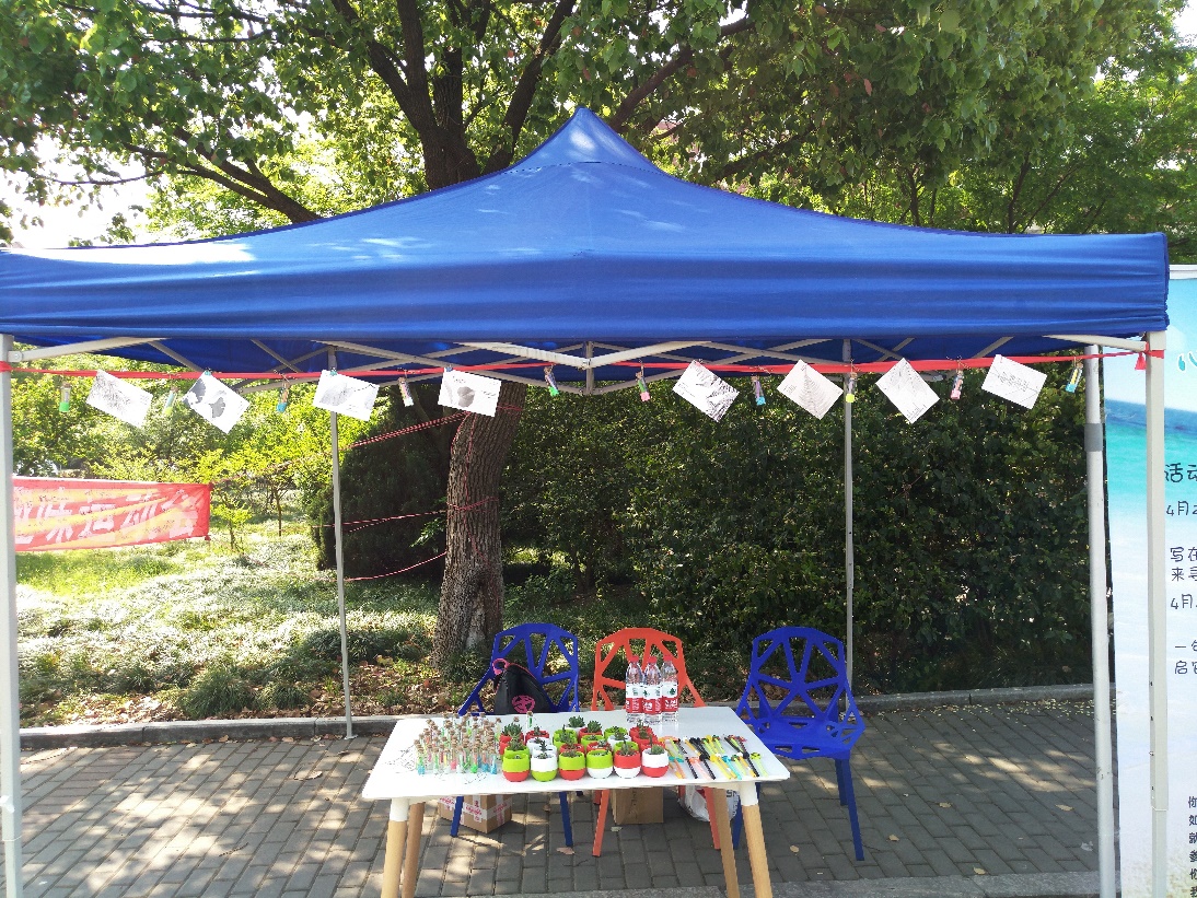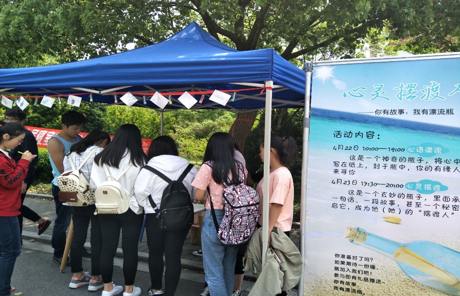4月22日,天气晴朗,春风洋溢,校园里充满着自由蓬勃的青春气息。材纺学院心理中心的3名工作人员早在8点开始,在老食堂布置活动现场,精美的伞棚装饰,配上炫彩的漂流瓶和明信片,处处体现了活动的丰富性和多趣性。