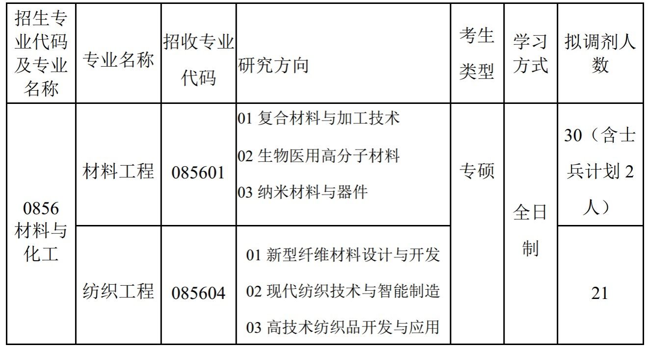 (2)调剂考生第一志愿专业与调入专业相同相近,或初试科目与调入专业初试科目相同相近。本学位点接受调剂的第一志愿专业范围包括:材料与化工(0856)、材料科学与工程(0805或0773)、电子科学与技术(0809或0774)、信息与通信工程(0810)、计算机科学与技术(0812或0775)、化学工程与技术(0817)、纺织科学与工程(0821)、轻工技术与工程(0822)、环境科学与工程(0830或0776)、生物医学工程(0831或0777)、药学(0780、1007或1055)、食品科学与工程(0832)、软件工程(0835)、生物工程(0836)、纳米科学与工程(0877或0789)、电子信息(0854)、机械(0802或0855)、资源与环境(0857)、生物与医药(0860)、化学(0703)、生物学(0710)。
