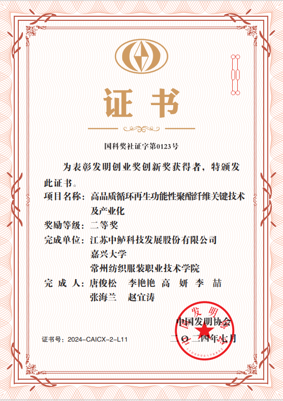 高品质循环再生功能性聚酯纤维关键技术及产业化,二等奖,唐俊松,李艳艳,高妍,李喆,张海兰,赵宜涛